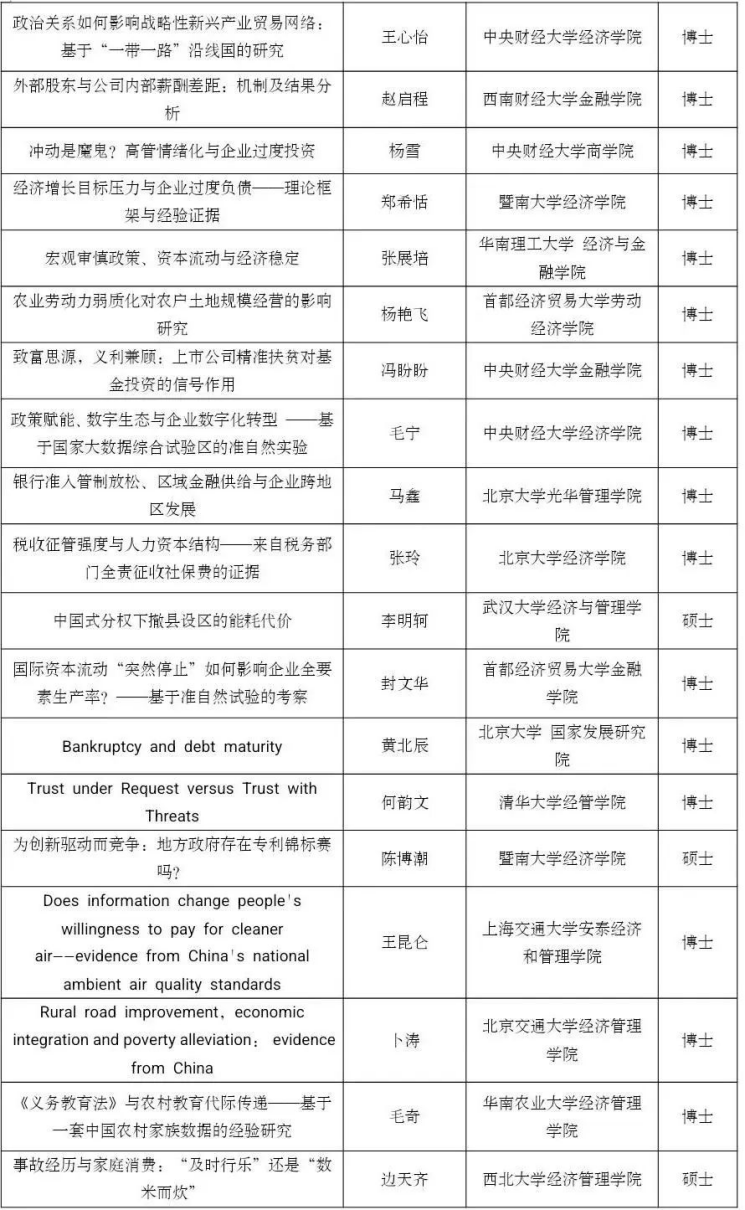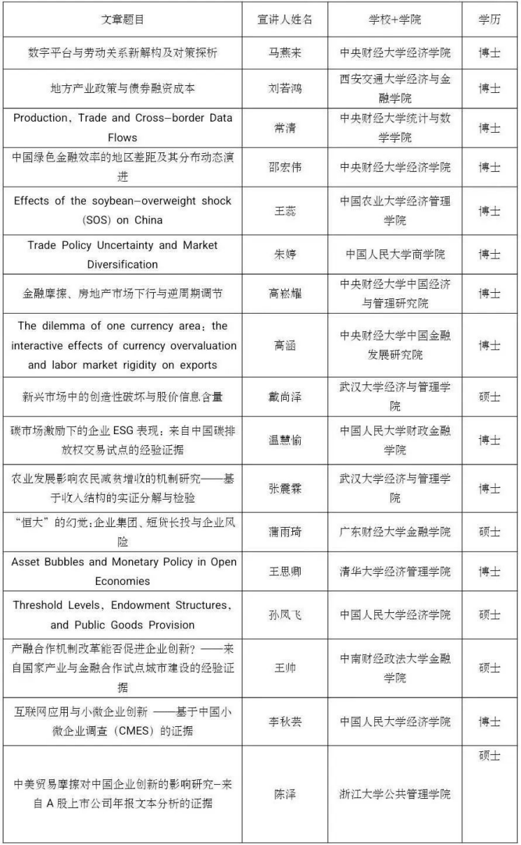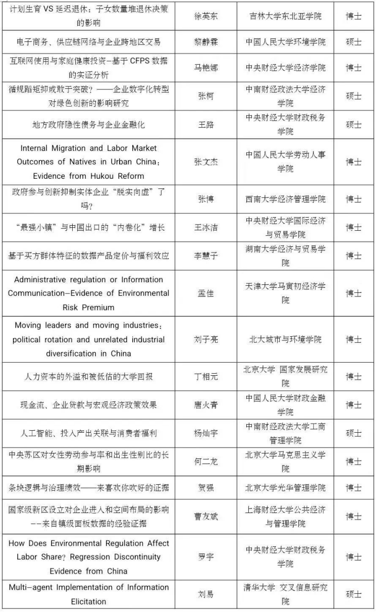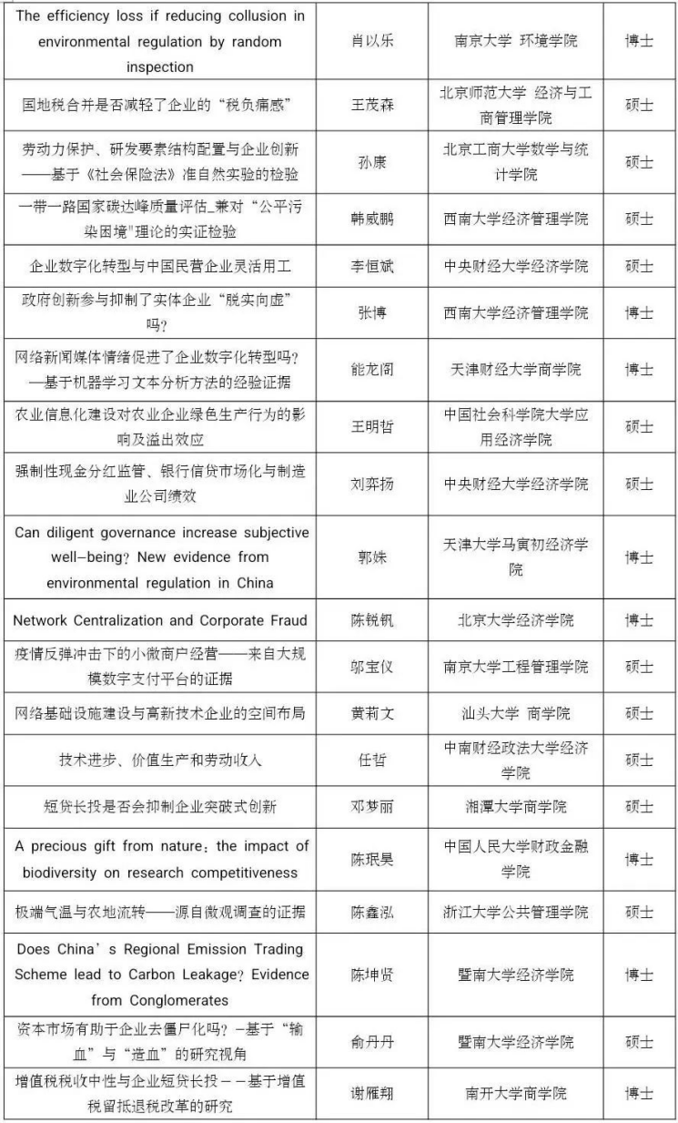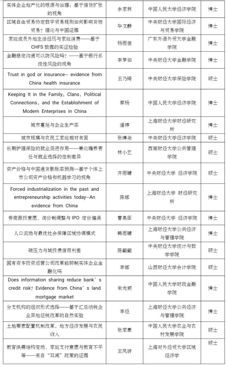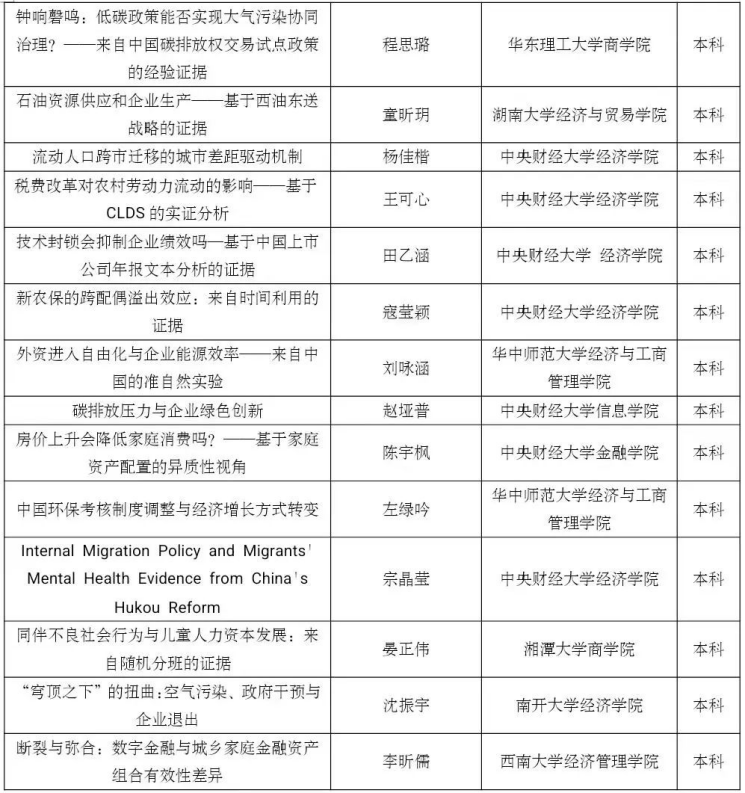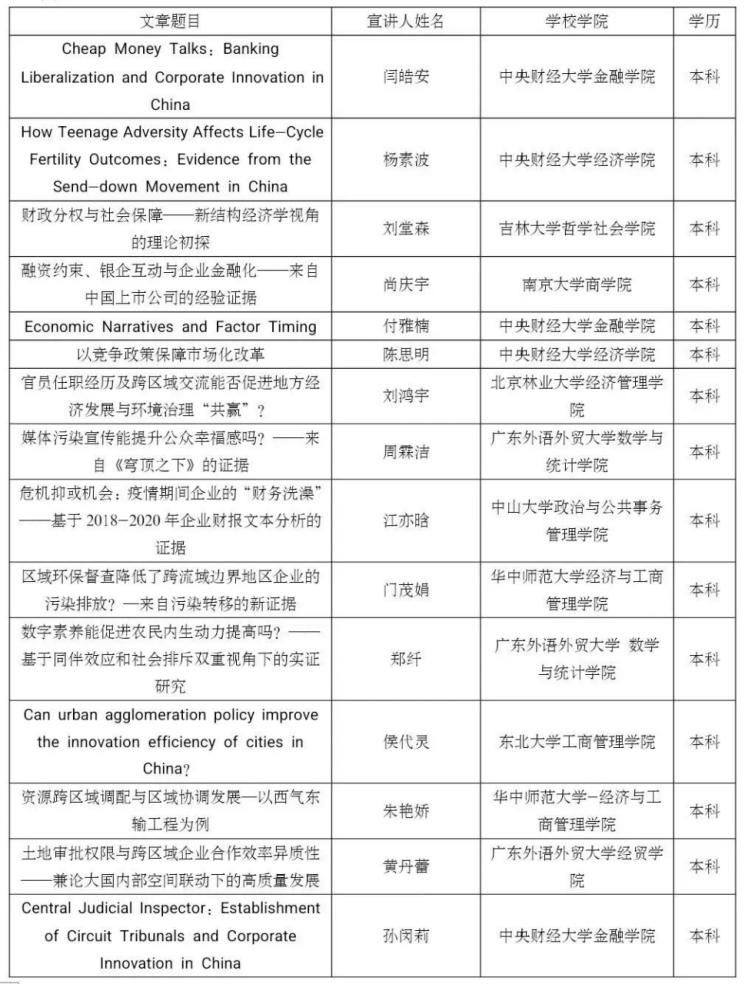 党的二十大报告指出,“教育、科技、人才是全面建设社会主义现代化国家的基础性、战略性支撑”。为了学习、贯彻和落实党的二十大关于教育和人才建设的精神,365best体育亚洲官网联合中国经济学年会、中国青年经济学家联谊会主办第五届未来经济学家论坛。本论坛坚持“公平、公正、公开”的原则,鼓励思想争鸣、学术创新,旨在为未来有志于从事经济学研究的全国高校在校学生(本科生和研究生)提供一个观点交流、思想碰撞的学术交流平台。本次论文征集环节共收到612篇投稿论文,经过评审论证和评审,最终遴选出126篇入围会议,名单如下,恭喜各位入选的同学: