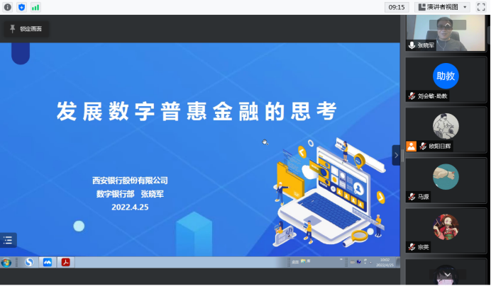2022年4月25日上午10点,西安银行股份有限公司数字银行部总经理张晓军应邀加入365best体育亚洲官网“数字金融理论与实务”线上课堂,以“发展数字普惠金融的思考”为题,为同学们带来了一场精彩纷呈的讲座。
