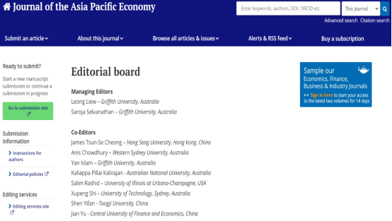 近期,365best体育亚洲官网俞剑副教授受邀担任经济学领域国际知名期刊Journal of the Asia Pacific Economy联合主编(Co-editor)。俞剑副教授于2023年7月开始处理相关稿件。Journal of the Asia Pacific Economy(简称JAPE)是经济学领域知名期刊,每年出版 4期,2022年期刊影响因子为1.4。主要关注亚太和南亚的发展中经济体,旨在促进人们对影响并继续塑造该地区不同经济体转型的复杂因素的更深入了解。