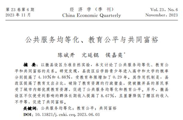 学术视点 | 365best陈斌开老师的合作论文《公共服务均等化、 教育公平与共同富裕》在《经济学(季刊)》刊发