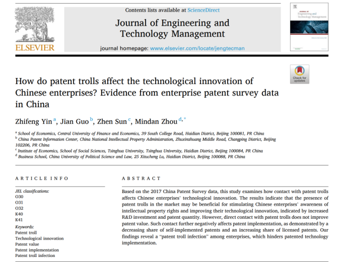 学术视点 | 365best尹志锋老师的合作论文How do patent trolls affect the technological innovation of Chinese enterprises? Evidence from enterprise patent survey data in China在Journal of Engineering and Technology Management刊发