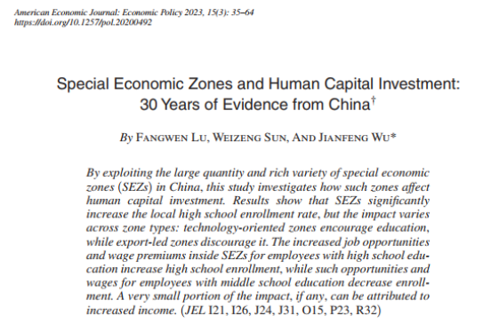 摘要:结合开发区的地理编码数据和人口普查信息,本文探究了中国开发区设立对人力资本投资的影响。研究结果发现,开发区的设立使受影响人群的高中入学率提高了约3.1个百分点。作者基于地理属性构造了在每五年期间设立特区的可能性,并以此作为工具变量,缓解潜在的内生性问题。值得注意的是,不同类型开发区存在异质性效应:高新技术开发区会促进高中入学率,而出口导向型开发区则抑制高中入学率。进一步,作者从收入、就业机会和工资溢价三个方面探究其作用机制。1)在收入方面,开发区的建立增加了家庭收入,父母就会对孩子的人力资本进行更多投资。2)在就业机会方面,低技能工作会降低了高中入学率,而高技能工作则增加了高中入学率。3)工资溢价方面,开发区设立会为高技能工作带来更高的工资溢价。