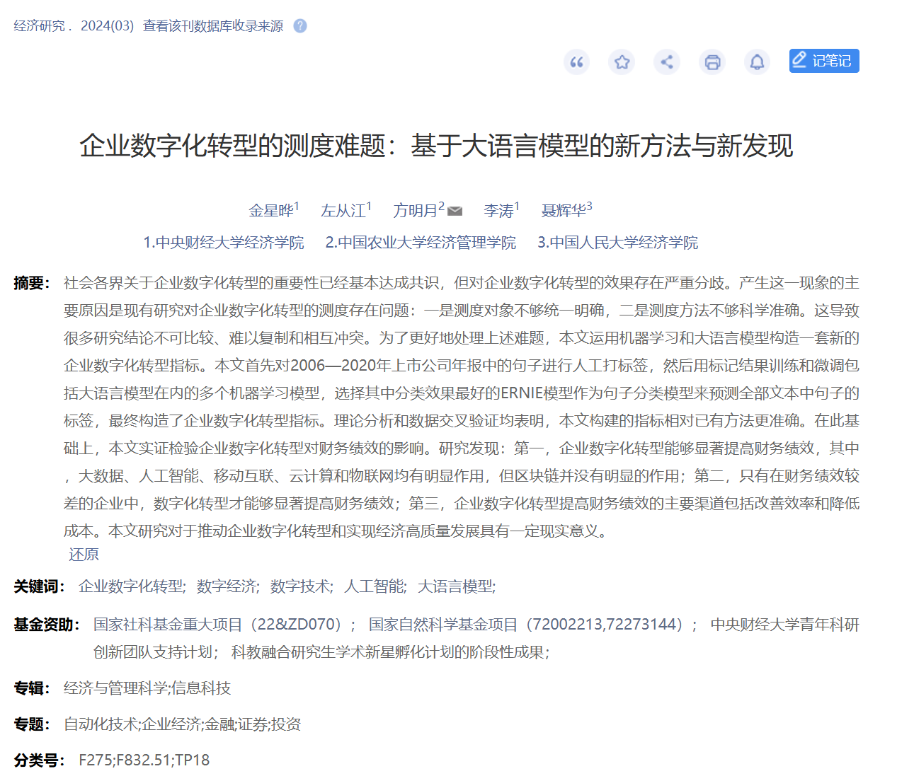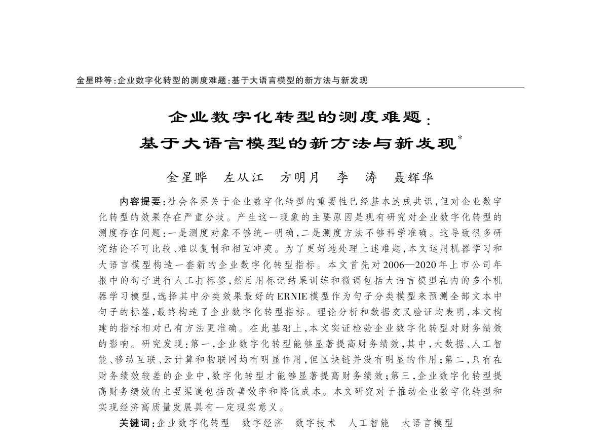 摘要:社会各界关于企业数字化转型的重要性已经基本达成共识,但对企业数字化转型的效果存在严重分歧。产生这一现象的主要原因是现有研究对企业数字化转型的测度存在问题:一是测度对象不够统一明确,二是测度方法不够科学准确。这导致很多研究结论不可比较、难以复制和相互冲突。为了更好地处理上述难题,本文运用机器学习和大语言模型构造一套新的企业数字化转型指标。本文首先对2006—2020年上市公司年报中的句子进行人工打标签,然后用标记结果训练和微调包括大语言模型在内的多个机器学习模型,选择其中分类效果最好的ERNIE模型作为句子分类模型来预测全部文本中句子的标签,最终构造了企业数字化转型指标。理论分析和数据交叉验证均表明,本文构建的指标相对已有方法更准确。在此基础上,本文实证检验企业数字化转型对财务绩效的影响。研究发现:第一,企业数字化转型能够显著提高财务绩效,其中,大数据、人工智能、移动互联、云计算和物联网均有明显作用,但区块链并没有明显的作用;第二,只有在财务绩效较差的企业中,数字化转型才能够显著提高财务绩效;第三,企业数字化转型提高财务绩效的主要渠道包括改善效率和降低成本。本文研究对于推动企业数字化转型和实现经济高质量发展具有一定现实意义。