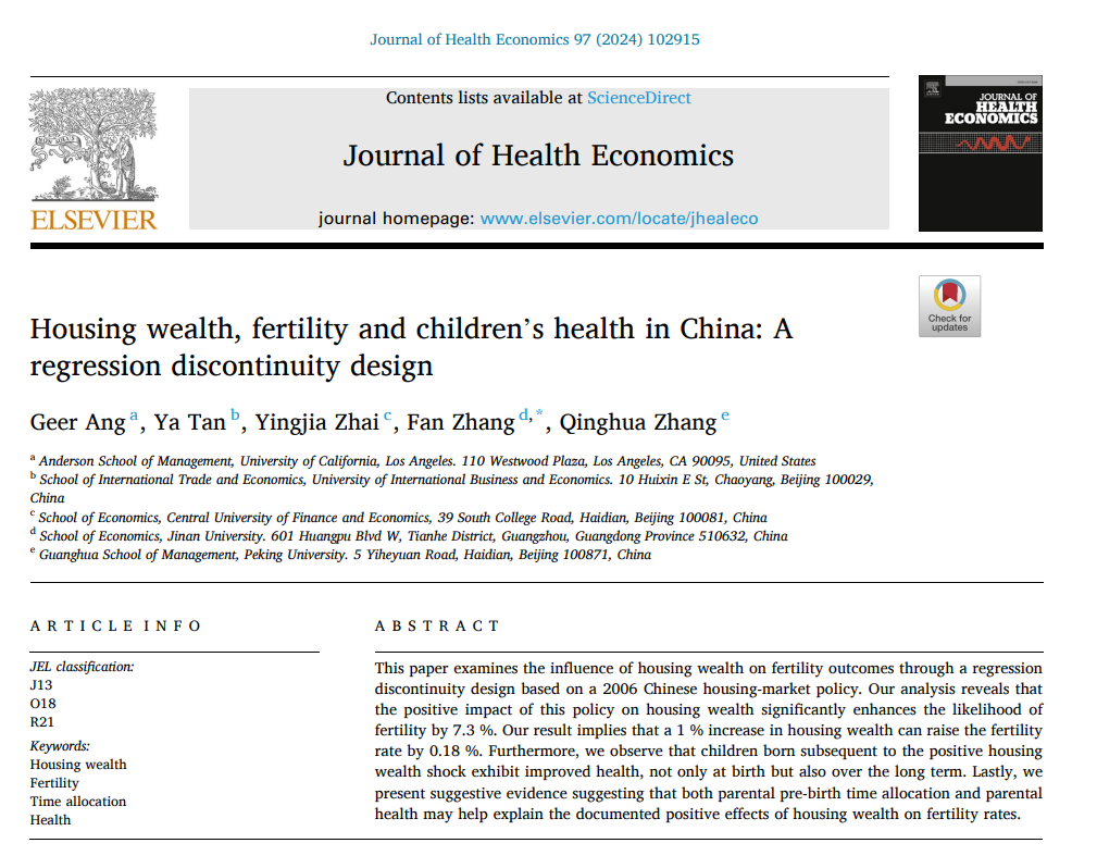 学术视点 | 365best翟颖佳老师的合作论文Housing wealth, fertility and children's health in China: A regression discontinuity design在国际顶级期刊Journal of Health Economics刊发