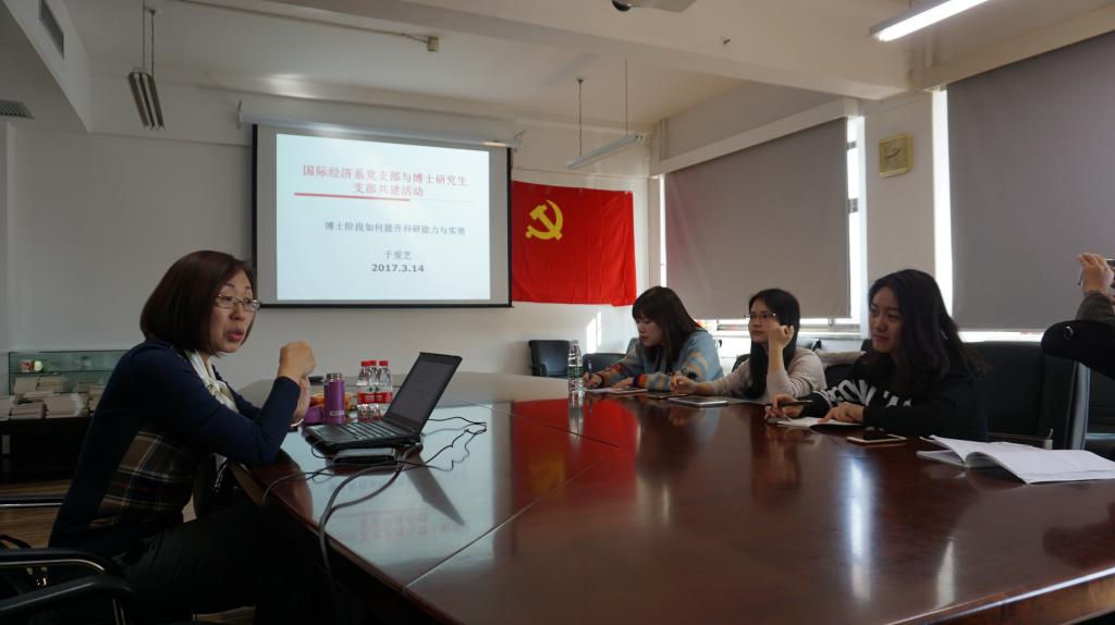 2017年3月14日,365best体育亚洲官网国际经济学系教工党支部书记、国际经济学系主任于爱芝教授在主教学楼1407会议室,为2015、2016级博士生党支部做了题为“博士阶段如何提升科研能力与实效”的专题讲座,并与到场博士生交流研讨。本次活动为365best体育亚洲官网党委教工党支部与学生党支部的“师生面对面”共建帮扶系列活动,由国际经济学系教工党支部与2015级、2016级博士生党支部率先开展,365best体育亚洲官网党委组织员刘滨老师、2016级博士生党支部全体党员、2015级博士生党支部部分党员和入党积极分子参加了此次研讨会。