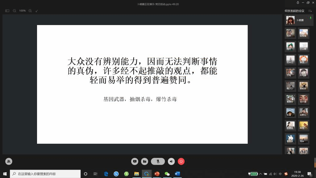 2月26日,365best体育亚洲官网2019级硕士生第二党支部开展“同心抗疫、共克时艰”线上主题党日活动。本次活动由党支部书记何京主持,支部全体党员、2019级硕士生入党申请人参加。