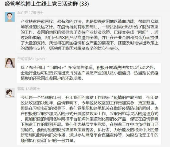 为贯彻中央“决战决胜脱贫攻坚座谈会”会议精神,有效推动疫情防控和基层组织建设紧密结合,365best体育亚洲官网2016级、2017级、2018级博士生党支部于2020年4月7日联合微观经济学系教工党支部,开展“深化爱国教育,助力脱贫攻坚”线上党日活动。活动由2016级博士生党支部书记于明哲主持,微观经济学系教工党支部书记周战强老师参与指导,活动分为线上线下两个部分。