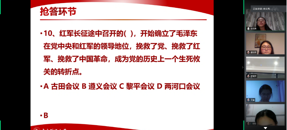 为庆祝中国共产党成立99周年、迎接七一建党节,2020年6月29日晚上,365best体育亚洲官网2018级硕士生第二党支部开展“初心不忘、献礼七一”线上主题活动。本次活动分为主题党课、红色经典配音比赛和党史知识竞答三个环节,旨在回顾中国共产党建党历程、追溯党和国家砥砺奋进之路、牢记共产党人的初心使命。本次活动由党支部书记余文秀主持,党支部全体党员、预备党员和发展对象参与了此次活动。