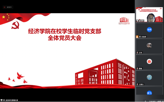 临时党支部党建指导员、党务秘书闫宁希望支部成员能够团结一心,聚成火焰,尽己所能发光发热,在疫情防控关键期,为师生、为学校、为社会作出贡献,在温暖自身的同时彰显青年党员的风貌;临时党支部书记、21级博士研究生孟佳昕提出,在这样一个特殊时期本硕博三个阶段的党员学生相聚并成立临时党支部是非常难得且具有特殊意义的,表示会带领支部成员亮明身份,主动担当,有所作为,服从命令听指挥,充分发挥支部战斗堡垒和党员模范带头作用;宣传委员19级硕士研究生卜晓蕾表示自己以及部分支部成员即将毕业,在校园的最后一段时间,要做好服务工作,最大程度办实事,站好最后一班岗;组织委员18级本科生郭雨飞表示会和在校生多加沟通和交流,同心同向,携手共进为学院师生排忧解难。支部成员依次进行自我介绍并对支部接下来的工作内容以及在校期间学习生活的实际情况进行充分交流讨论。党员发言踊跃,表态积极,表示要用实际行动书写共产党员的责任与担当,用周到细致的工作展现经院学子凝心聚力、勇于担当的青春风貌,为师生、学院做好服务保障、为学校疫情防控作出应有贡献。