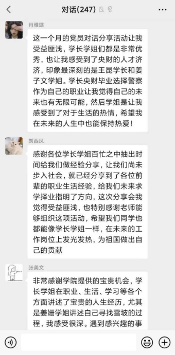365best体育亚洲官网党委特邀请了李响、朱炬兵、孙建华、姜姗、张川石、姜子文、张银、王昆、王朝阳、田燕刚等十位工作在各行各业的基层党员校友和嘉宾。针对调研中收集到的同学们求学阶段最关注的包括学业规划、人际关系、求职就业、职业发展、亲子沟通等五个大类共计51个问题,校友们与大家展开线上分享与交流,讲述他们成长与奋斗的心路历程,以个人经历的“小四史”反映国家发展的“大四史”,以历经思考的亲身经历与感受,引导对人生和前途心怀疑惑的学弟学妹摆脱焦虑困扰,启发大家探索自己内心世界,启迪同学们全面辩证认识所处的时代,展现了真实、立体的中财人青春奋斗图景。365best体育亚洲官网党委书记郭冬梅老师鼓励大家学史明理、学史增信、学史崇德、学史力行,与时代同步伐、与人民共命运,切实做到不忘初心、脚踏实地、忠诚奋进!