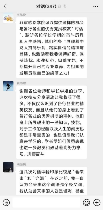 本次历时一个月的主题教育活动吸引了365best体育亚洲官网240余名师生参加。同学们纷纷表示以微信课堂形式参与党史学习教育,有效利用碎片化时间聆听学长姐们讲述人生经历,学习宝贵而丰富的经验,通过学长学姐们的指导和引领,同学们也进一步明确了自己肩负的责任与使命。