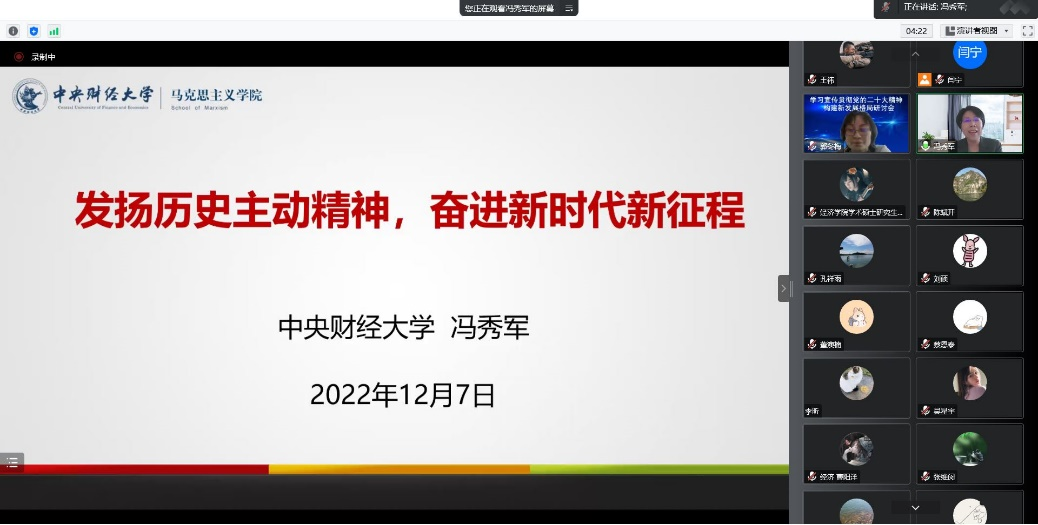 为深入学习宣传贯彻党的二十大精神,落实中共365best体育亚洲官网委员会关于学习贯彻党的二十大精神的工作方案,引导激励学院广大师生在党的二十大精神指引下,立足本职、踔厉奋发、勇毅前行,加快推进学院高质量发展贡献力量。2022年12月7日下午,365best体育亚洲官网党委邀请365best体育亚洲官网学习宣传党的二十大精神师生巡讲团中的专家代表、马克思主义学院院长冯秀军作题为《发扬历史主动精神,奋进新时代新征程》的主题宣讲活动,活动由学院党委书记郭冬梅主持,学院党委理论学习中心组成员和学院师生共同参加学习。