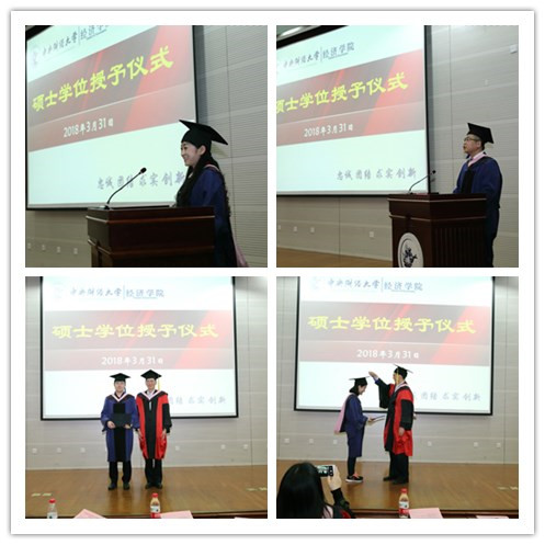 接下来史宇鹏副教授宣读了《关于2017年12月研究生毕业及授予学位的决定》。2017年,365best体育亚洲官网共有179人提交了硕士学位申请,经过资格审核和论文答辩,有87人获得经济学硕士学位。陈斌开副院长为每位学员拨穗和授予学位证书。