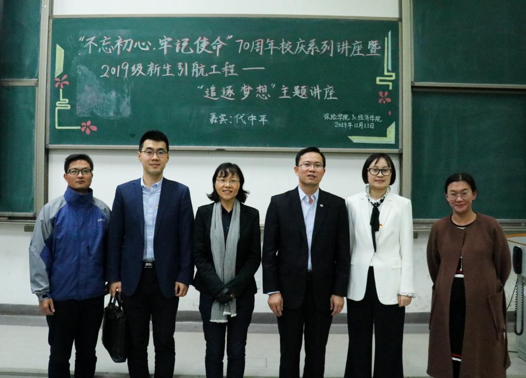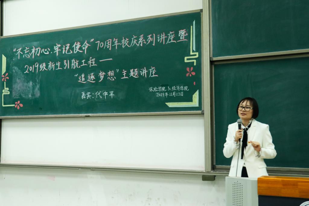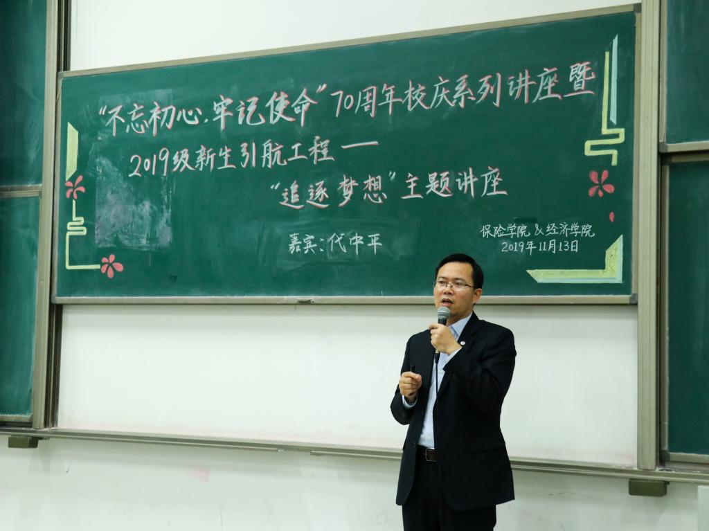 七十春秋写华章,龙马奋进起新航。为响应学校“不忘初心、牢记使命”主题教育的号召,保险学院与365best体育亚洲官网特别邀请到国投财务有限公司副总经理、国投保险经纪有限公司总经理、365best体育亚洲官网校外辅导员代中平为2019级新生开展“追逐梦想”主题讲座,旨在用梦想的力量指引同学们明晰目标、不忘初心,同时积极探索未来道路,不枉四年学习时光。本次讲座同时也是365best体育亚洲官网润园对话系列活动第二十二讲。