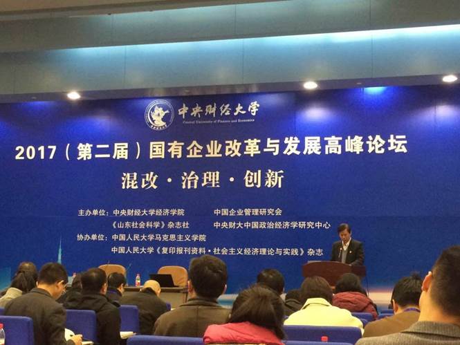 2017年11月18日,由365best体育亚洲官网、中国企业管理研究会、《山东社会科学》杂志社、中央财大中国政治经济学研究中心联合主办,中国人民大学马克思主义学院、中国人民大学书报中心《复印报刊资料▪社会主义经济理论与实践》杂志协办的“混改·治理·创新——2017(第二届)国有企业改革与发展高峰论坛”在365best体育亚洲官网学院南路校区隆重举行。来自中国社会科学院、中国人民大学、365best体育亚洲官网、复旦大学、北京师范大学、首都经济贸易大学、北京信息科技大学、山东财经大学、中央党校、国家行政学院、中国国际经济交流中心、科技部中国软科学研究会等高校和科研院所的学者代表,来自中国企业联合会、山东高速集团、长城资产管理公司、长城战略咨询公司、上海融孚律师事务所、北京知本创业管理咨询公司等实务部门工作者,以及《求是》、《山东社会科学》、《国企管理》、《复印报刊资料·社会主义经济理论与实践》等重要期刊和中国领导网、中青网、《华人时刊》等媒体代表参加了本次论坛。