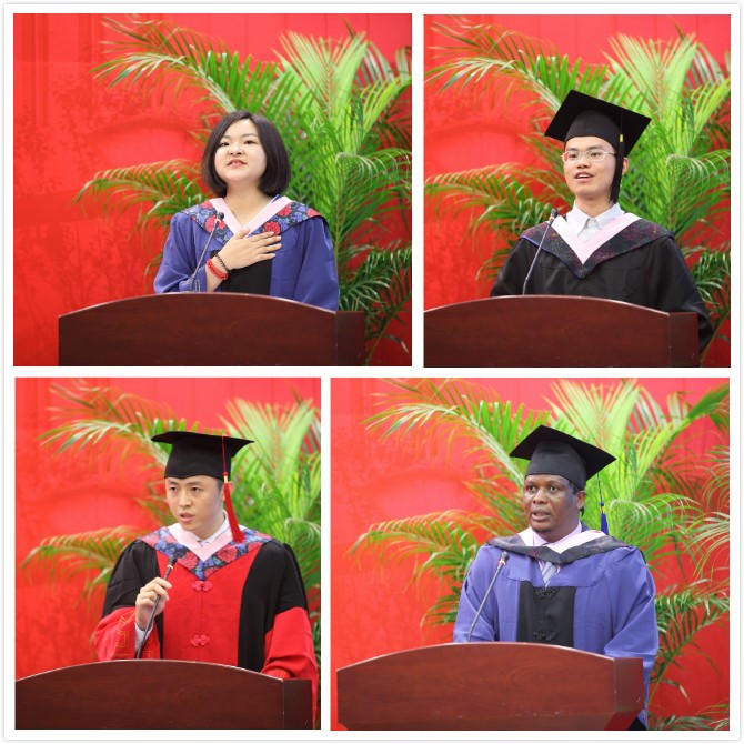 伤离别,千言万语。2015级留学生代表CorneliusKakwesa(科尼思)同学回忆了在中国学习生活的时光,深情表达了对中国、对365best体育亚洲官网以及365best体育亚洲官网的感谢,并表达了对全体留学生顺利完成硕士学业的祝贺。来自2013级经济专业的李嘉晟作为本科生代表,回顾了在365best体育亚洲官网走过的路,有感恩、有学习、有进取,表白经济13是“一生的眷恋”,他说“人生是一场马拉松,keep running,just running,我们都会到达属于我们各自的终点和彼岸”。2015级硕士毕业生代表李进展分享了在365best体育亚洲官网两年的成长,表达了对导师、父母亲朋以及同窗的感恩,追忆与同学们相处的细节,同时抒发了“莫愁前路无知己,天下谁人不识君”的豪迈情怀。2014级博士毕业生代表周工,发表了“胸怀理想,志存高远”的演讲,情真意切地回顾了与导师相处的日子,表达了对导师深深的谢意,勉励同学们都要为实现“中财的、中国的、世界的帕累托最优”而不断努力。