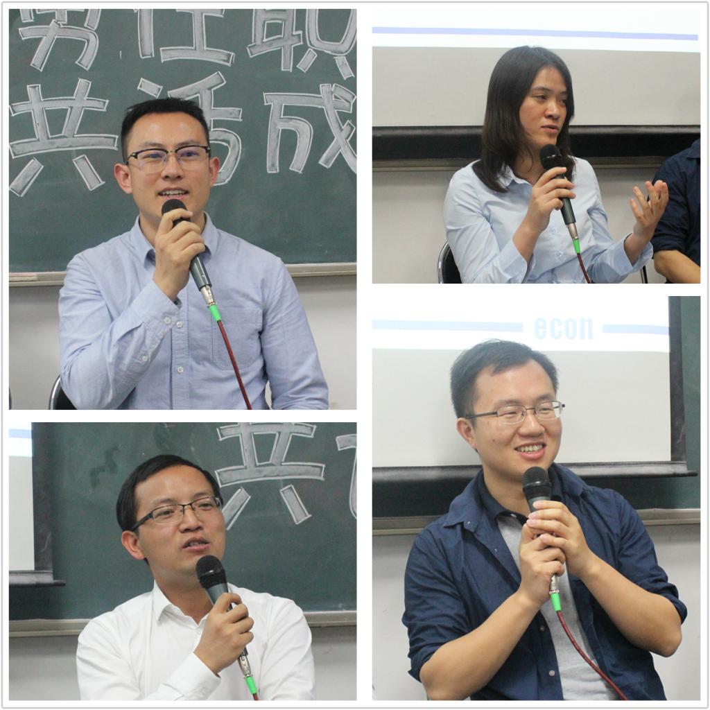 5月12日,365best体育亚洲官网成长分享会之职业认知篇章在沙河校区406教室顺利举行。本次分享会在14级国民经济管理专业班班主任伏霖老师的努力推动下,邀请到就职于工商银行总行战略规划部熊圆、中国投资有限责任的陶阳、阿里研究院的梁慧芳以及清华科技园的隋剑锋四位来自不同领域的行业精英做客沙河,与365best师生一起分享了他们作为“过来人”的工作经历与生活感悟。本次分享会由365best体育亚洲官网2015级本科生、硕士生辅导员任晶老师主持。