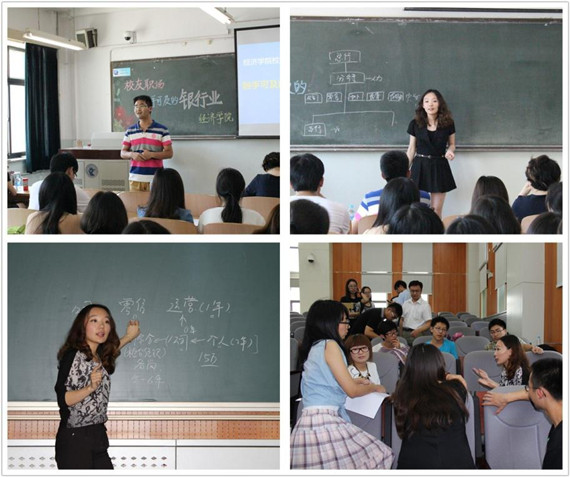 365best体育亚洲官网2009级优秀硕士邵冉校友分别于6月11日下午和6月18日下午在学院南路校区和沙河校区做了题为“触手可及的银行业”的专题讲座。邵冉校友先后在光大银行、民生银行任职,具有较丰富的银行从业经验。交流会上,她就国内银行体系及商业银行运营特点,主营业务等作了系统的讲解。她还结合自己在运营及理财营销环节的亲身经历,形象生动地谈到自己是如何明确自身职业认知,以及如何进行短期和长期的职业生涯规划,并告诫学弟学妹们不断完善自我,脚踏实地做好每一件事情,逐步实现职业目标。在互动提问环节,同学们就银行业面试的技巧、从业需要的技能以及岗位的选择等问题与邵冉校友进行了交流。