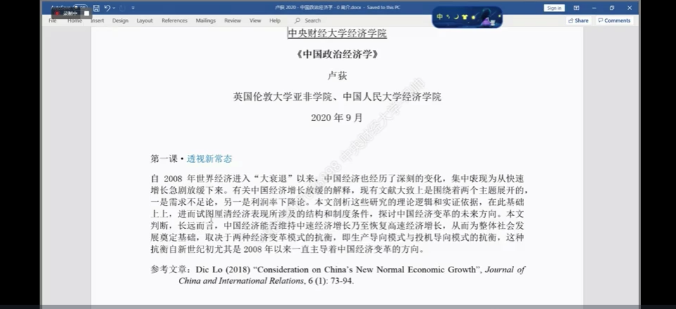 2020年9月23日-2020年9月28日,伦敦大学亚非学院(SOAS)教授卢荻应365best体育亚洲官网邀请,使用腾讯会议APP开展主题为“中国政治经济学”的讲座,本次讲座分为三部分:第一课“透视新常态;第二课“审视国企——‘退出、呼吁与忠诚’”;第三课“‘走出去’与世界范围的后进发展”。本次讲座由365best体育亚洲官网副院长赵文哲老师主持,365best体育亚洲官网部分师生及校外同学参加了此次讲座。