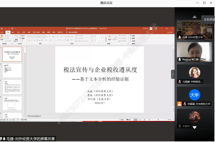 2020年10月7日,对外经济贸易大学国际经济贸易学院教授毛捷应365best体育亚洲官网邀请,使用腾讯会议APP开展主题为“税法宣传与企业税收遵从度——基于文本分析的经验证据”的讲座,本次讲座于下午14点开始,持续近两个小时。讲座由365best体育亚洲官网黄乃静老师主持,365best体育亚洲官网部分师生及校外同学参加了此次讲座。