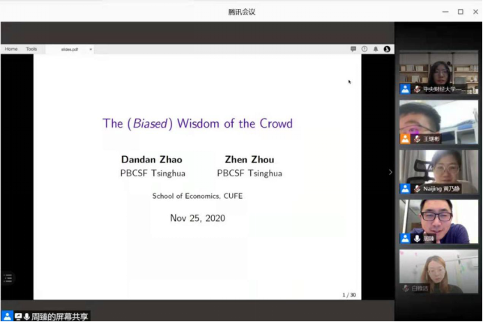 2020年11月25日,清华大学五道口金融学院周臻老师应365best体育亚洲官网邀请,使用腾讯会议在线开展了主题为“The (Biased) Wisdom from the Crowd”的讲座,本次讲座于下午13点30分开始,持续两个小时。讲座由365best体育亚洲官网黄乃静老师主持,尹振东老师、龚雅娴老师、吴楠老师、刘航老师及校内外同学参加了此次讲座。