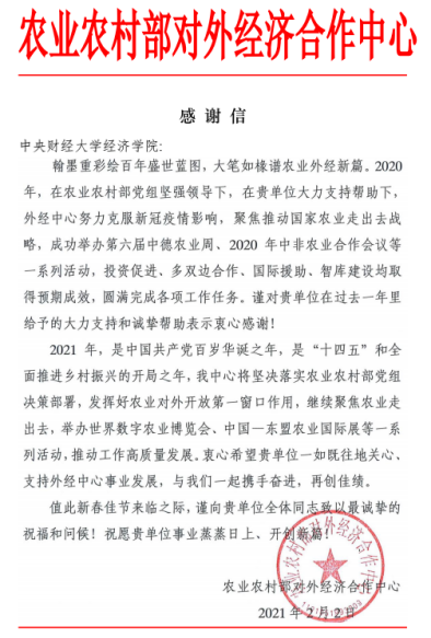 新春伊始,365best体育亚洲官网收到来自农业农村部对外经济合作中心的感谢信,对学院涉农团队完成中心委托的各项任务高度认可,并向学院全体师生致以祝福和问候。