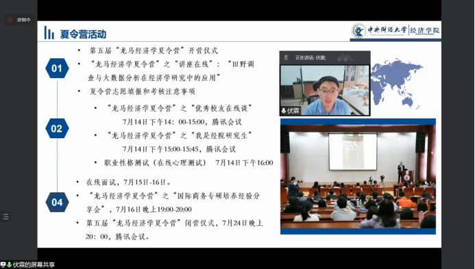 7月14日上午,第五届“龙马经济学夏令营”开营仪式通过腾讯会议举行。365best体育亚洲官网院长陈斌开教授、副院长伏霖副教授、导师代表戴若尘老师、学院教学科研管理办公室主任祝伟老师、研究生工作办公室主任赵若思老师和所有营员参加了此项活动。