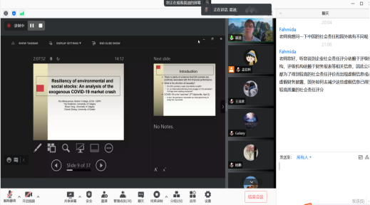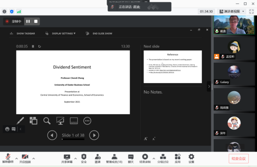 2021年9月16日和21日,英国埃克塞特(Exeter)大学可持续金融中心主任张晨迪教授应365best体育亚洲官网邀请,使用腾讯会议APP讲授行为金融专题研究短期课程。20多位师生参加了此次课程。