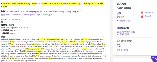 近日,365best俞剑副教授与郭冬梅教授、财政税务学院杨龙见副教授、悉尼科技大学施训鹏研究员合作发表在国际能源经济学领域知名期刊《Energy Economics》(2021年第2期)的文章Economic policy uncertainty (EPU) and firm carbon emissions: Evidence using a China provincial EPU index于2021年11月成功入选ESI前0.1%热点论文和前1%高被引论文,这是365best2021年唯一入选ESI前0.1%热点论文。该文使用高频词人工筛选和人工阅读相结合的方式筛选出经济政策、不确定性的基础词条,首次构建了中国省级层面的经济政策不确定性指数,并考察经济政策不确定性对中国企业碳排放行为的影响。