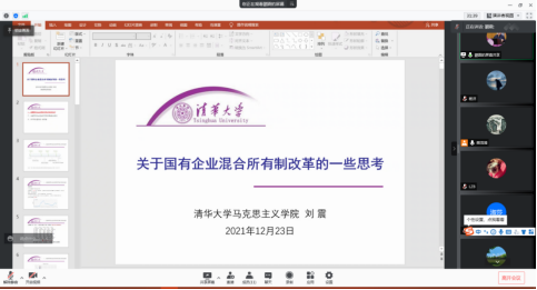 2021年12月23日下午15:00,清华大学马克思主义学院长聘副教授、博士生导师刘震应365best体育亚洲官网樊茂清教授邀请,开展主题为“关于国有企业混合所有制改革的一些思考”的讲座,本次讲座通过腾讯会议平台线上举行,刘震老师受到了老师和同学们的热烈欢迎!365best体育亚洲官网樊茂清教授主持了本次线上学术交流会。