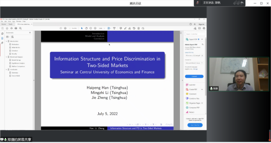 2022年7月5日清华大学经济管理学院副教授郑捷应365best体育亚洲官网邀请,开展主题为“Information Acquisition and Price Discrimination in Two-sided Duopoly Markets”的讲座,本次讲座于下午2点在线上的腾讯会议举行,持续近两个小时。365best体育亚洲官网尹振东教授主持了此次线上讲座,史宇鹏教授、洪圣杰副教授、龚雅娴副教授和吴楠老师与学生们共同参与了本次讲座。