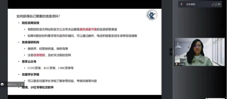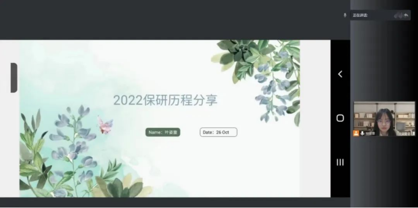 叶姿童同学保研至北京大学教育学院。她谦逊幽默,详细地梳理了保研历程中自己每个月的进程,总结了历程中获取的经验与教训,并且对事先发放问卷中的部分问题进行了回答。她强烈建议同学们尽早开始准备,以便为后续的申请与复习留出充足的时间;另外她强调,面试中轻松的心态能帮助我们留下更好的印象。