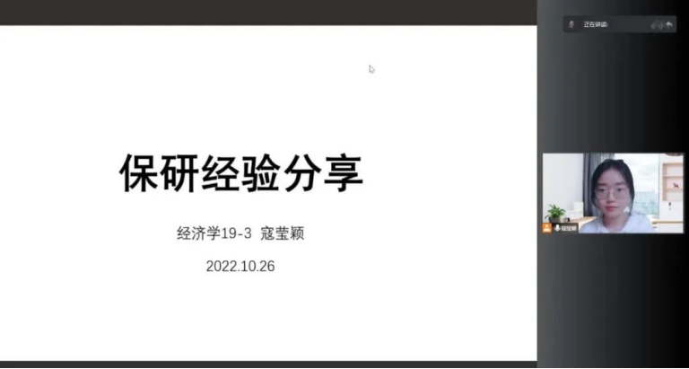 为落实做细精准化学业指导、解决学生升学规划的困惑,在充分做好问卷调研、收集同学的问题后,2022年10月26日晚七点,“经济学家梦工场”德育示范基地组织召开保研经验分享讲座,参会同学覆盖20、21、22三个年级。讲座由学院团委副书记、2020级辅导员梁欣主持,宗晶莹、叶姿童、王可心和寇莹颖四位19级成功保研的同学为学弟学妹们进行保研历程与经验分享,参会同学提问积极、反响热烈。