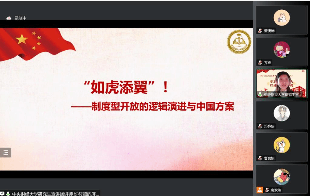 许筱颖从海南自由贸易区的建立引入话题,从历史沿革、逻辑演进、中国方案、未来展望四个方面介绍了“制度型开放”这一概念,制度性开放是中国现代化的必要要求,也是中国参与全球治理、承担国际责任、拓展共建全球治理显规则的必要途径,中国通过建立21个自贸区及海南自由港、设立服务业扩大开放综合试点城市、建立“沪港通”、“港深通”等资本流动机制等方式,从商品市场、服务市场、金融市场等方面多层次推动“制度型开放”,给出了“制度型开放”的中国方案。宣讲最后,许筱颖总结道,制度型开放符合新时代我国经济高质量发展的要求,对推动我国经济进一步发展,走向世界舞台的中心有着“如虎添翼”的作用。