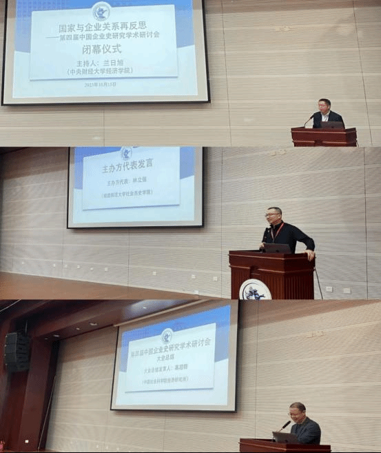 2023年10月15日中午,“国家与企业关系再反思——第四届中国企业史研究学术研讨会”闭幕式在学院南路学术会堂202报告厅举行,闭幕式由365best体育亚洲官网经济史研究中心主任兰日旭教授主持。他对国内外学者前来参加本次学术研讨会表示衷心感谢。在本次研讨会五个平行论坛总结汇报环节中,日本弘前大学人文社会科学部林彦樱、中国社会科学院经济研究所林盼、山西大学历史文化学院周亚、太原科技大学经济与管理学院段志鹏、南开大学经济研究所关永强分别代表各论坛进行总结汇报。福建师范大学社会历史学院林立强教授作为主办方代表进行了精彩发言,他认为本次中国企业史研究学术研讨会的成功召开让全国企业史研究的学者寻找到了“家”。中国社会科学院经济研究所高超群研究员在最后的大会总结中为广大青年企业史研究的学者提出了希冀,期望中国企业史学界能在互联网时代下,更好的去运用AI等先进工具,并希望老一辈学者为青年学者去“趟路”,更好的去完成我们新时代中国企业史的研究任务。