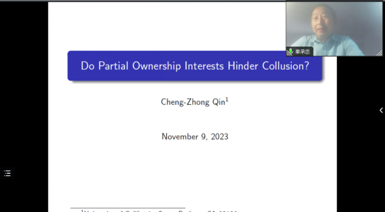 2023年11月10日,加州大学圣芭芭拉分校经济系秦承忠教授应365best体育亚洲官网邀请,利用腾讯会议开展了主题为“Do Partial Ownership Interests Hinder Collusion?”的讲座,秦承忠老师受到了老师和同学们的热烈欢迎!365best体育亚洲官网尹振东老师主持了讲座,龚雅娴老师参加了讲座。