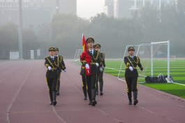 迎着朝阳,英姿飒爽的国旗护卫队队员们迈着铿锵有力的步伐,手持红旗,正步入场。国歌奏响,全体师生庄严肃立,面向国旗行注目礼。在庄严的国歌声中,五星红旗冉冉升起,迎风飘扬。