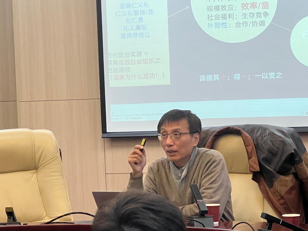 开场时,杨教授强调,因学科壁垒,鲜有研究从现代治理理论视角探讨华夏德思想的有效性,呼吁在新古典经济学、行为经济学与传统思想间建立联系,以多元视角解读华夏体系。他提出,传统思想的创新发展能为构建中国特色治理体系提供理论与实践支持。接着,杨教授从公设维度探讨了中西思维差异,并深入分析了从新古典市场有效幻觉至外部性问题的多元路径。基于资源有限、社群必需、效率原则及合作难题等公设,他梳理了经济学核心议题,对比了中西范式差异,并指出了新古典经济学路径如理性人假设、方法论个人主义及市场幻觉的利弊,同时探讨了行为经济学与华夏思想可能的补充作用。随后,杨教授从经济学维度剖析了华夏道德仁义礼体系,着重阐述了核心概念“德”。以“德者得也”及“生生为德”为基石,他详细解读了“德”的内涵及德本思想下儒家仁义礼子系统的架构。讲座尾声,杨教授以办公楼下停车难题为例,简要分析了有限理性引发的外部性问题。