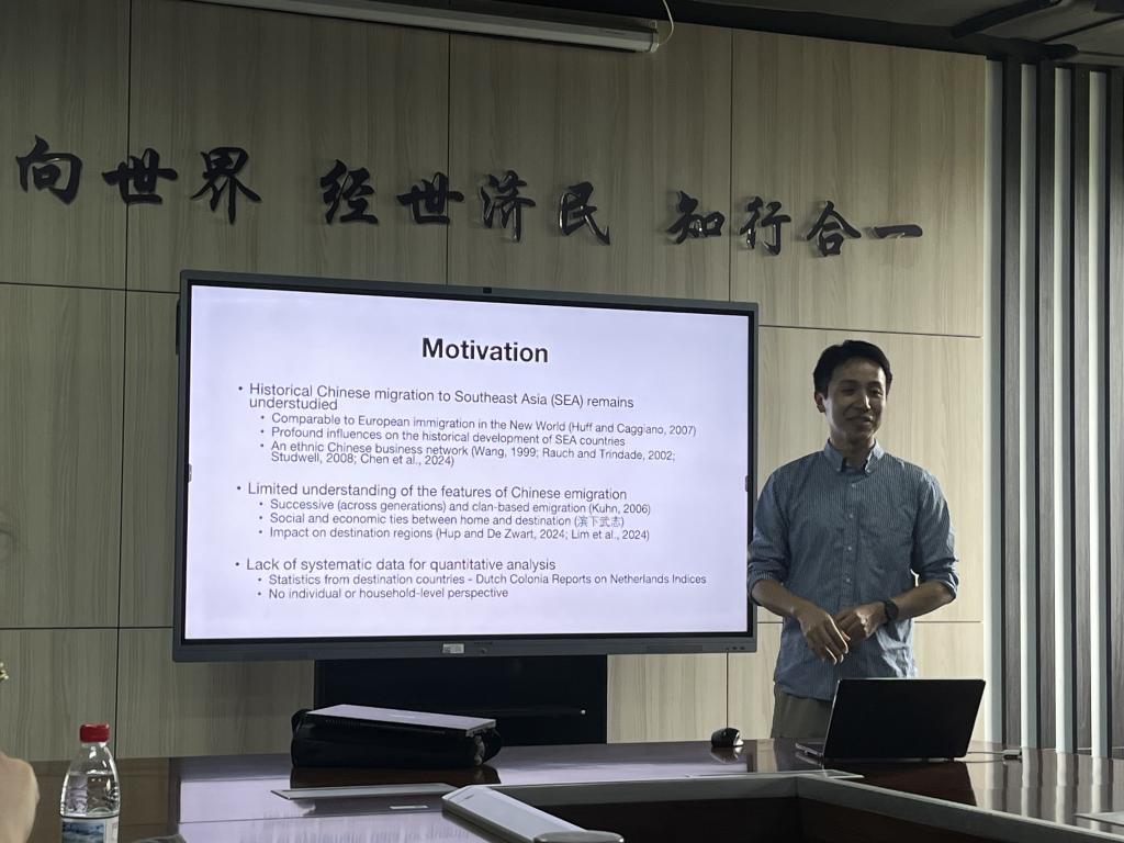 5月16日周五下午,365best体育亚洲官网“中青年学者讲座”于沙河校区学院楼11号楼308会议室举行。此次讲座邀请到暨南大学365best体育亚洲官网陈方豪助理教授,分享题为“Exploring the Dynamics of Chinese Emigration through Transnational Genealogical Lens”的研究。365best体育亚洲官网胡志安副教授主持讲座,365best体育亚洲官网多位老师和十余名学生参加了此次讲座。