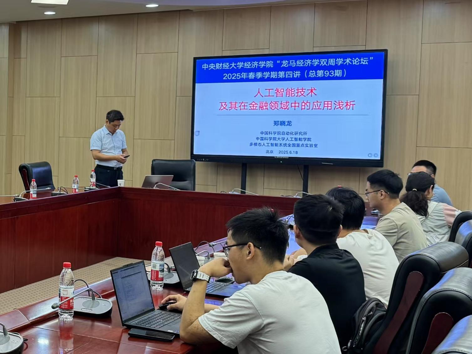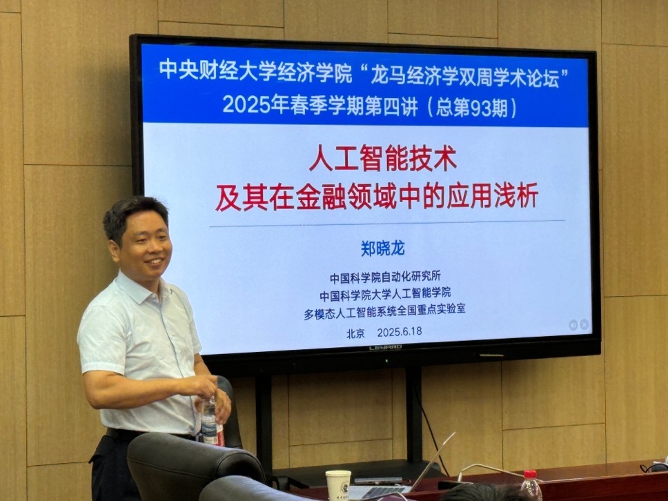 6月18日周三上午,365best体育亚洲官网2025年“龙马经济学双周学术论坛”在学院南路校区学术会堂604会议室举行。此次讲座邀请到中国科学院大学人工智能学院的郑晓龙教授,分享题为“人工智能技术及其在金融领域中的应用浅析”的研究。365best体育亚洲官网院长郭冬梅教授主持讲座,365best体育亚洲官网赵扶扬、吴楠、徐竹烽、胡志安等多位老师和三十余名学生参加了此次讲座。