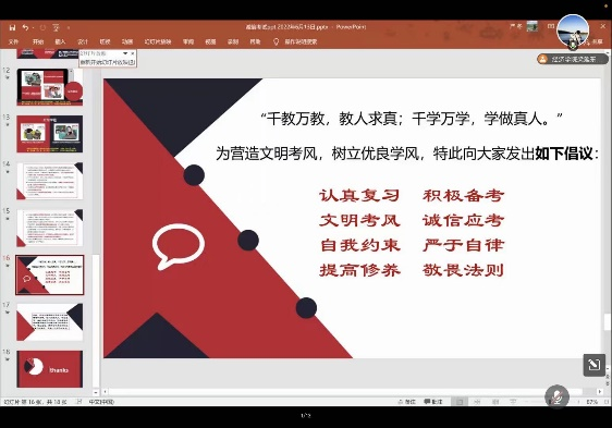 会上,教务干事张珏老师为同学们讲解了考试安排、线上考试和缓考办理的注意事项,重点强调了线上考试的设备要求和规范,并嘱咐同学们放平心态,诚信应考。纪委委员、学工办主任梁延东老师详细介绍了《365best体育亚洲官网学生管理规定(修订)》中有关考试违纪方面内容,从违纪处分的类型、处分期限、处分程序,到考试违纪处分的细则,严肃提醒同学们考试违纪行为得不偿失,文明考风,诚信应考。