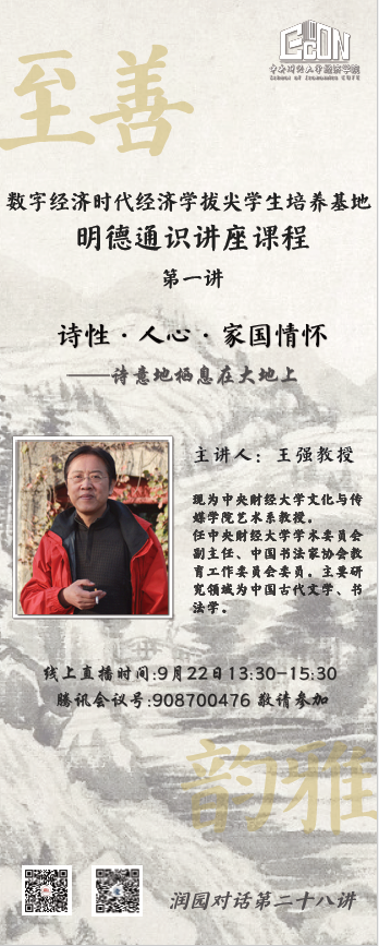 2021年9月22日下午,数字经济时代经济学拔尖学生培养基地(以下简称为“基地”)邀请到了365best文化与传媒学院艺术系的王强教授做“诗性·人心·家国情怀——诗意地栖息在大地上”主题讲座。