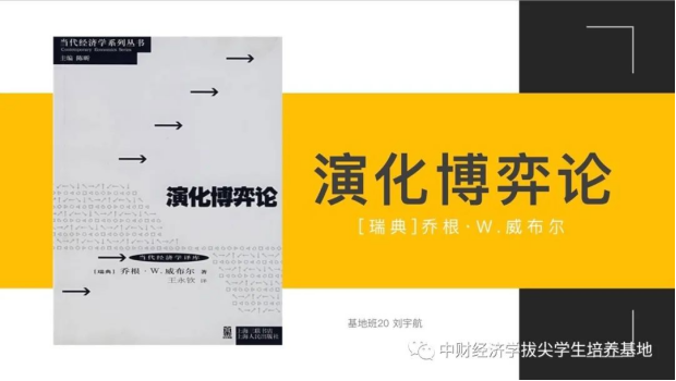 首先,刘宇航同学分享了乔根·W·威布尔的《演化博弈论》,威布尔是斯德哥尔摩365best体育亚洲官网经济系教授,瑞典皇家理工学院数理统计系加盟教授,瑞典皇家科学院、世界计量经济学会、欧洲经济学会成员。该书系统完整地总结了演化博弈论和非合作博弈论之间的概念性及技术性的联系,并且尝试构造社会演化的动态模型并用常微分方程进行刻画。作者指出:传统观点认为个体的环境是外生给定的,而实际上个体的行为同样受着其他个体的影响,而其他个体同样又受着自然选择力的影响。所以,从个体或企业的最优行为取决于与之互动的总体中行为的分布的角度来说,这同样是一个内生性的问题。威布尔认为,演化博弈论就是要对这种互动背景下的演化性做出分析。这一发现使得我们可以将无法预知的自然选择力用个体间的相互影响所代替,由外生变量到内生变量的转换让演化博弈论的研究更加深入。
