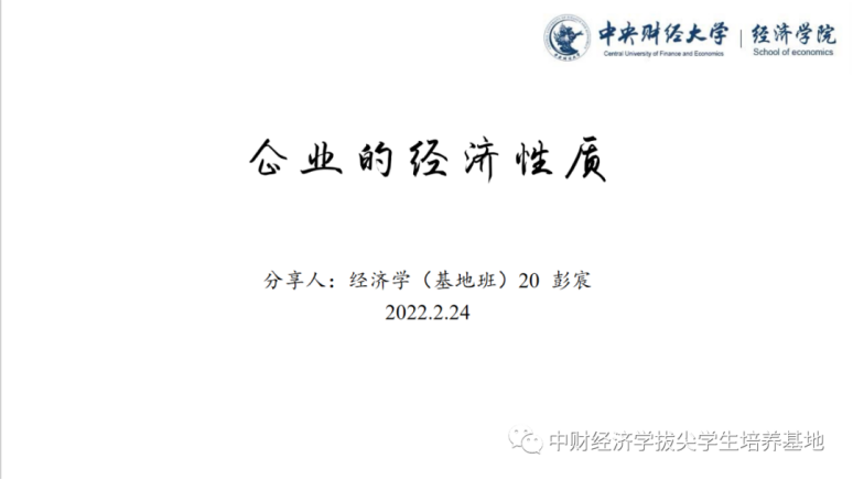 最后,彭宸同学介绍了由兰德尔•克罗茨纳(Randall Kroszner)、路易斯•普特曼(Louis Putterman)共同整理、撰写的《企业的经济性质》,这本书主要收集了在企业性质与组织等领域具有开创性贡献的文章,包括科斯(Coase)、奥立弗·威廉姆森(Oliver Williamson,2009年诺贝尔经济学奖得主)和迈克尔·詹森(Michael Jensen)与威廉姆·麦克林(William Meckling)的著作——同时收录了保罗·米尔格罗姆(Paul Milgrom,2020年诺贝尔经济学奖得主)、本特·霍姆斯特罗姆(Bengt Holmstrom,2016年诺贝尔经济学奖得主)、约翰·罗布茨(John Roberts)和奥利弗·哈特(Oliver Hart,2016年诺贝尔经济学奖得主)等人的作品。在这本书中介绍了有关企业的如下讨论:企业是什么、企业为什么存在、什么因素决定了企业和市场的边界、企业和市场的区分有多明晰、所有权关系和雇佣关系、工人和激励、代理和融资、为什么所有权应该与控制权相分离。其中本次读书会着重介绍了科斯的交易成本理论、威廉姆森的可被侵占租金与垂直一体化理论、阿尔钦和德姆塞茨的监督成本理论、米尔格罗姆和罗伯茨的信息过滤理论及其对于企业为什么存在、什么限制了企业的增长等问题。而根据对上述问题的介绍,不难发现,在当今对企业性质的讨论中,大家普遍认为需求及成本仅仅构成了对生产性活动的需求,企业这种组织性质的存在并非可被理想化的市场机制所解释,而是由现实中市场的不完全性所催生,在企业内部,究竟是行政力量主导还是市场力量主导则取决于市场完全性和市场力量影响企业内关系的能力。