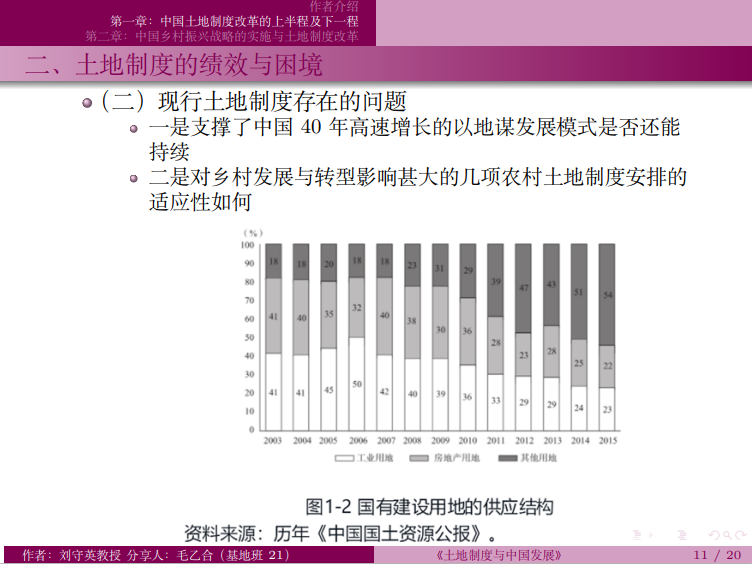 周子杰同学介绍了本书的第三章和第四章,主要包含城乡中国的土地问题和中国土地制度变革的基本逻辑。第三章深入分析了中国土地问题出现的原因,并介绍了乡土中国中的土地粘度的概念及形成原因,由此引出土地制度变革推动的人与土地关系的变迁,最后阐述当代城乡中国的主要土地问题,即发展阶段转换后土地功能变化,与土地配置制度不匹配,阻碍城乡中国发展。第四章总结了中国土地制度变革的基本逻辑,通过概述中国土地制度变革过程中的目标约束和制度约束,引出中国土地制度变革的基本逻辑,包括(1)所有制是锁定的,(2)在所有权和使用权分离的基础上做文章,(3)土地是发展的工具,随后分两阶段描述改革路线。然后介绍了两权分立改革、宅基地制度以及农村土地转用制度改革的后果,详细地描述这些制度改革产生的问题。